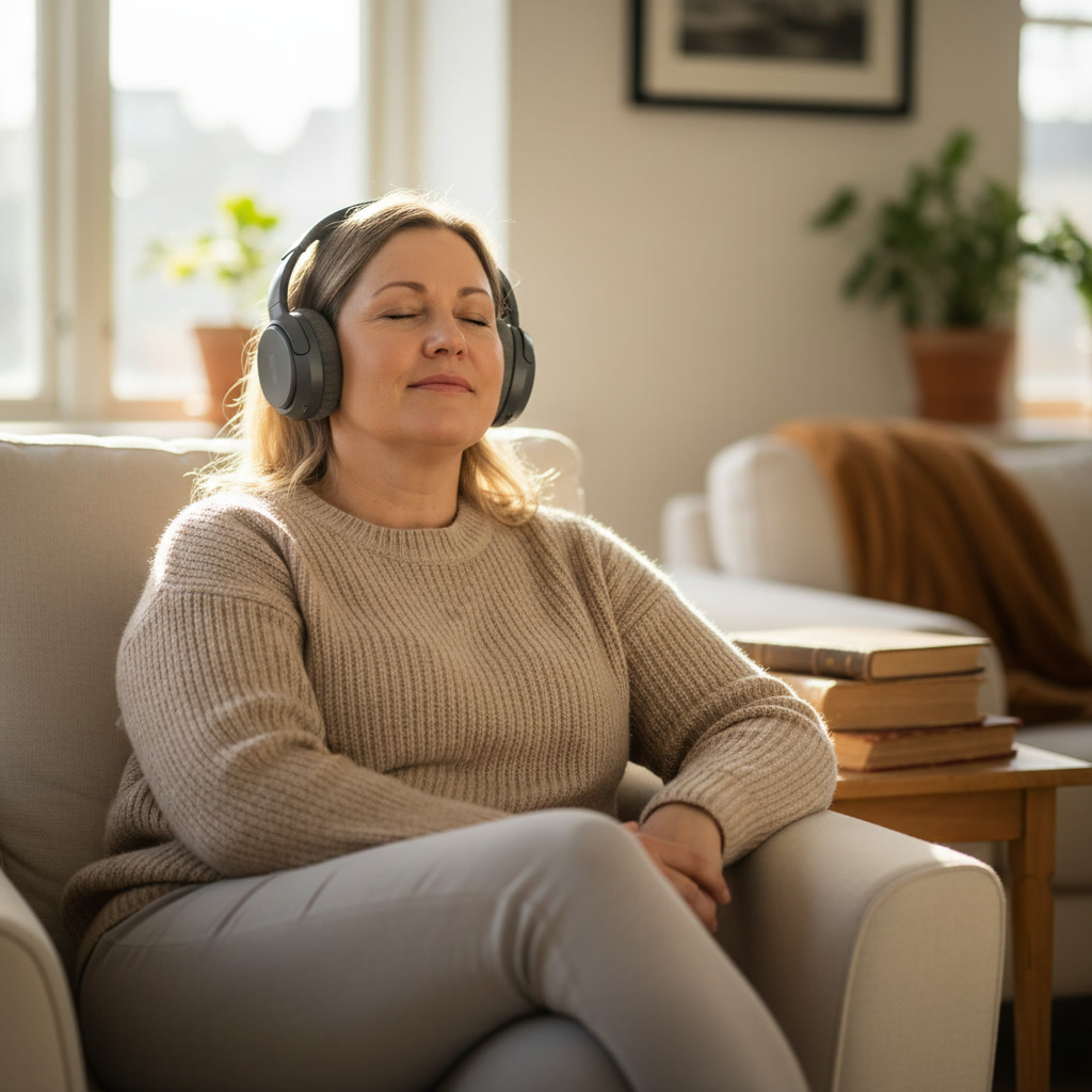 Du behøver ikke presse dig selv til faste møder, men kan lytte, når du er klar – og gentage så mange gange du har brug for.