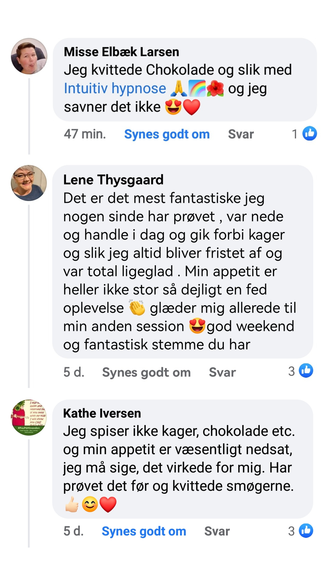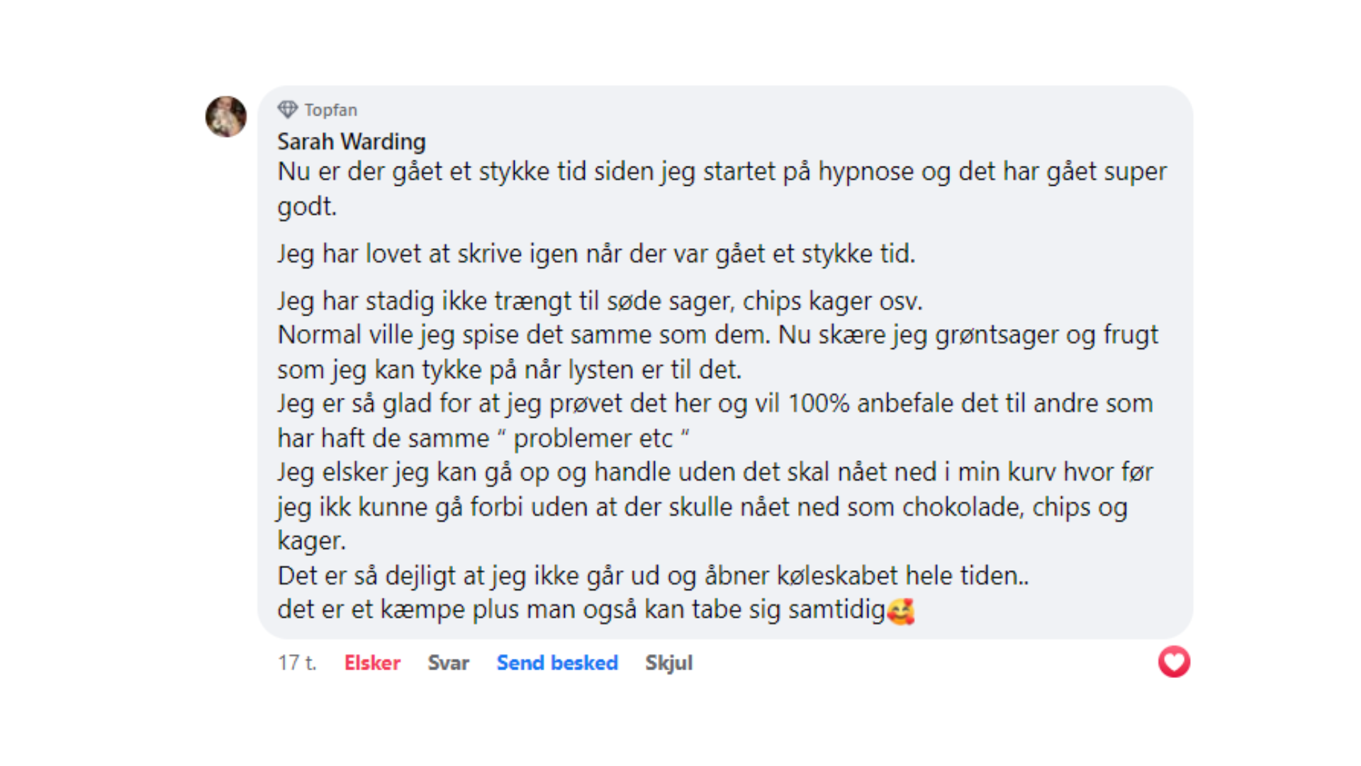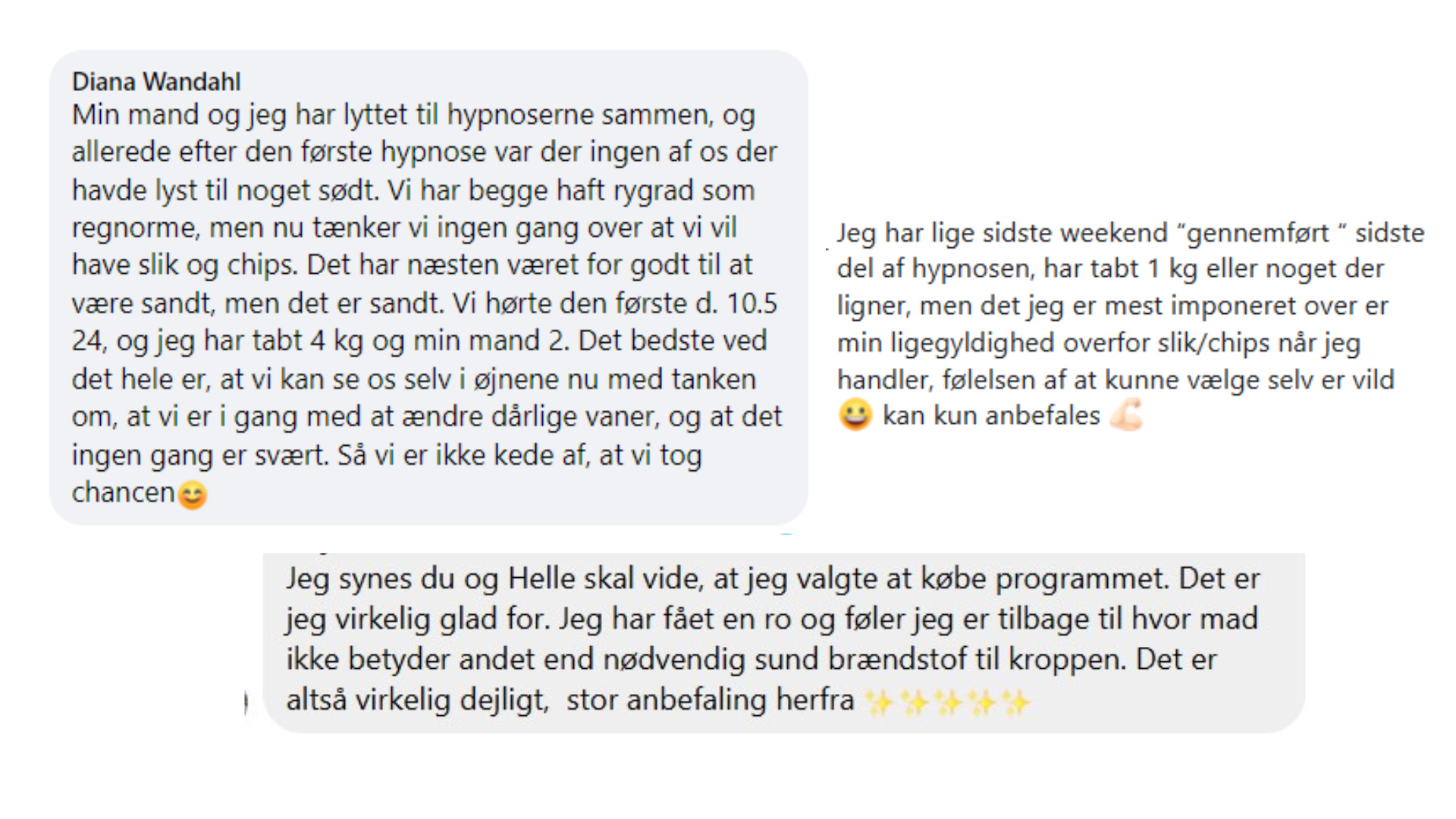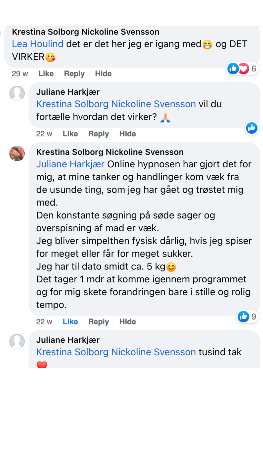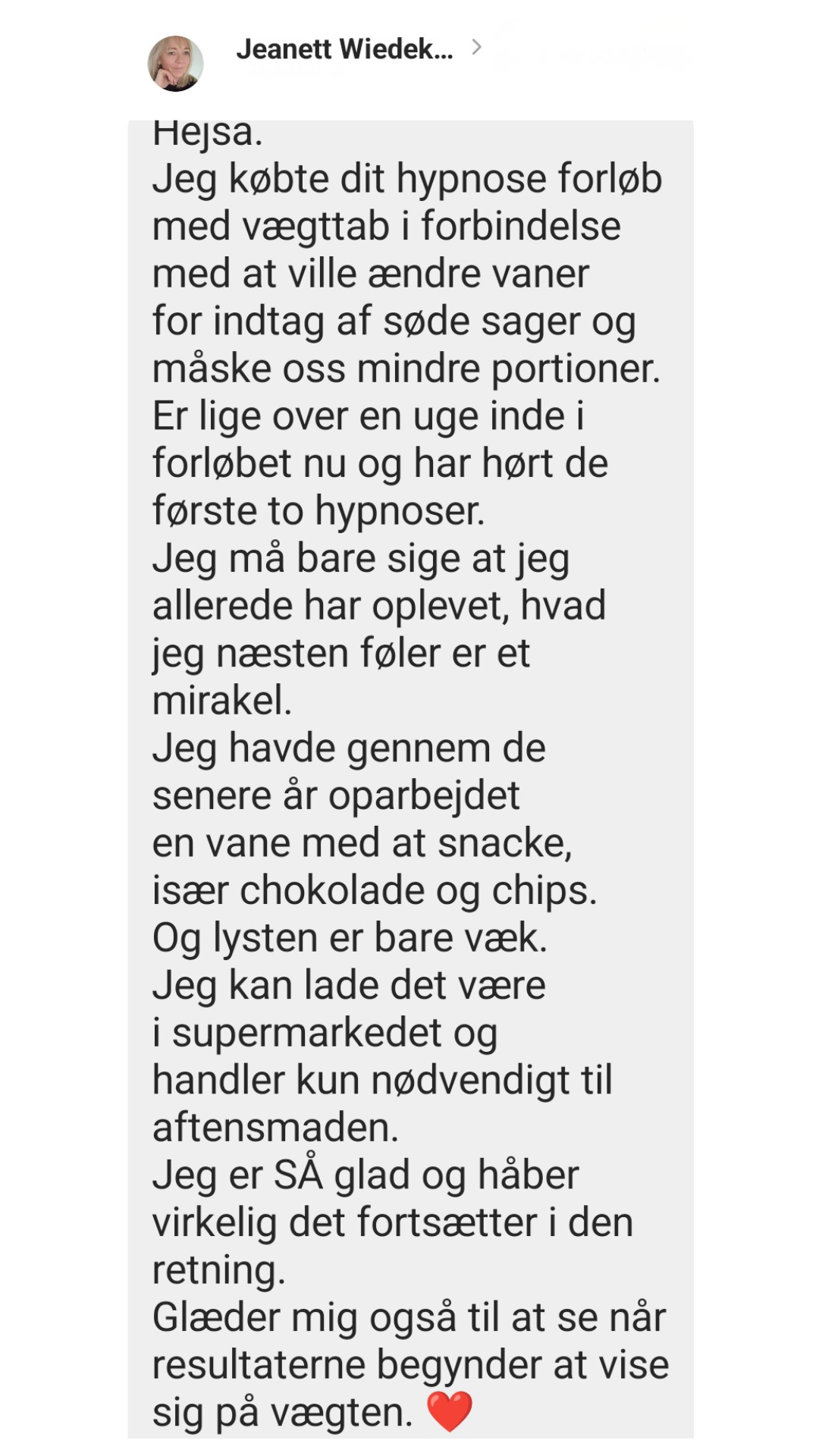 Jeg manglede sparket til ikke at spise så mange søde sager. Efter hypnoserne, lysten til søde var der, men mængden blev mindre og mindre. Jeg har stadig lysten til sødt, men spiser væsentlig mindre, og er gået en buksestørrelse ned nu + har mere energi efter en arbejdsdag end tidligere.