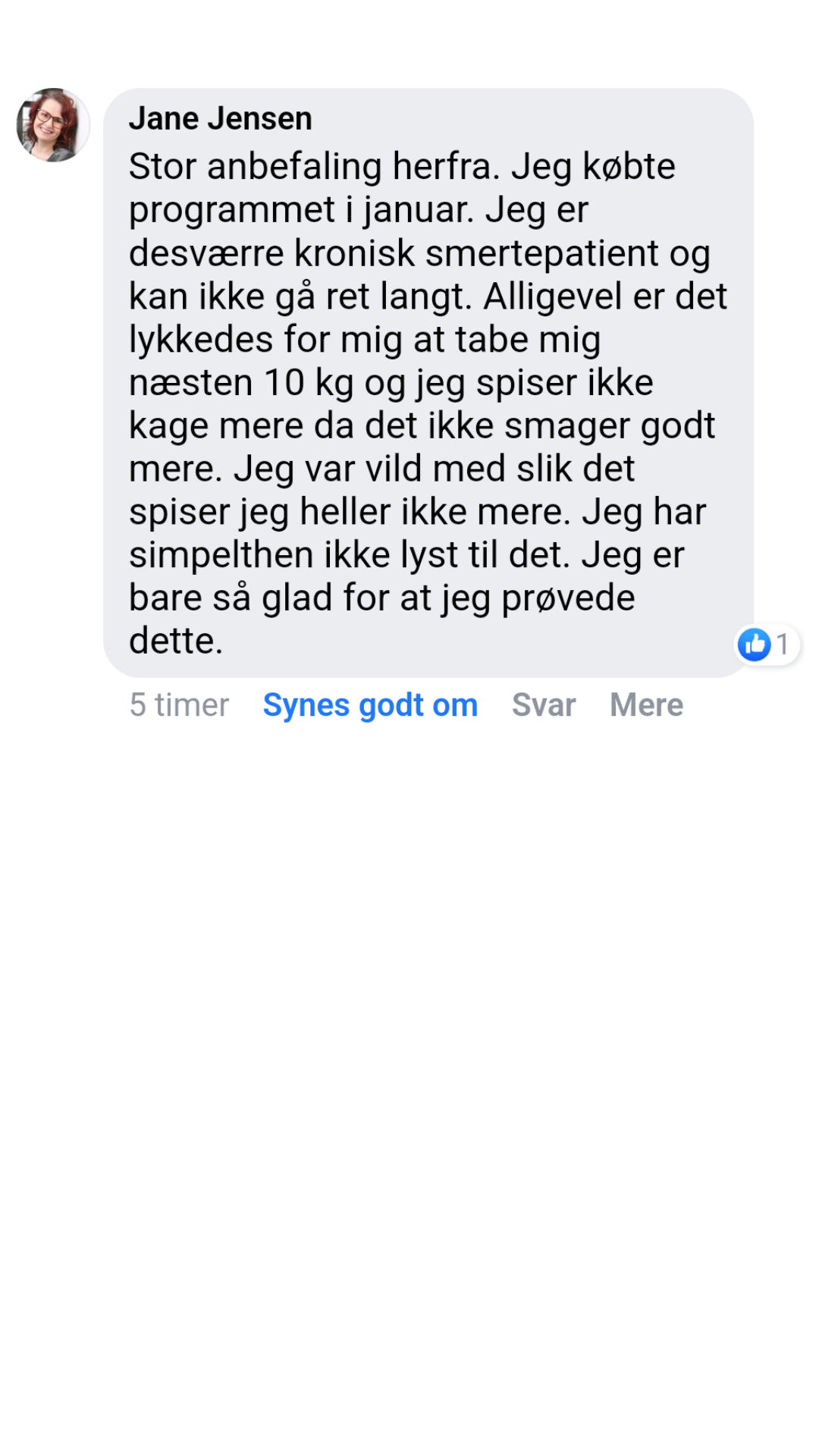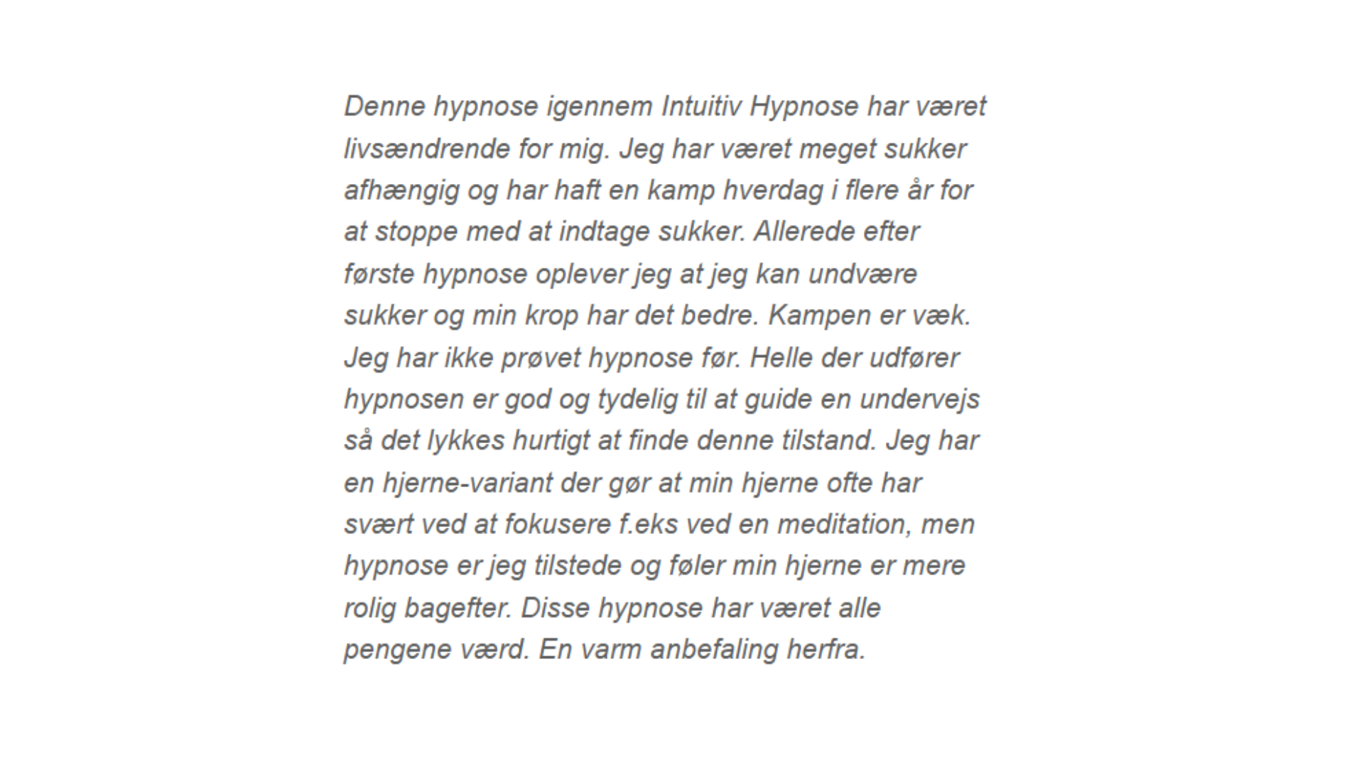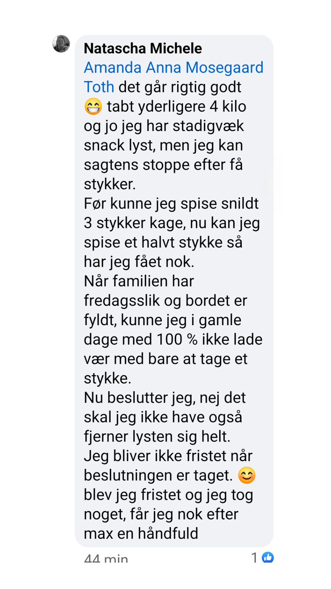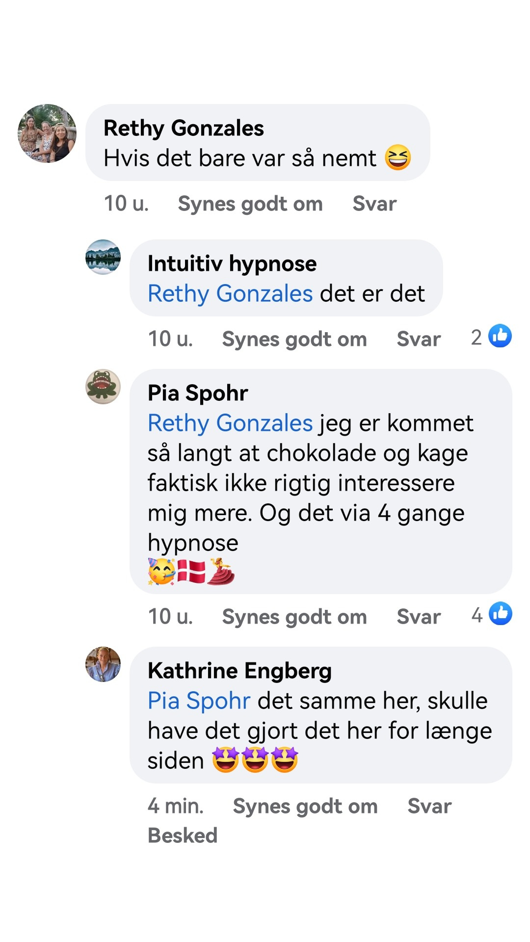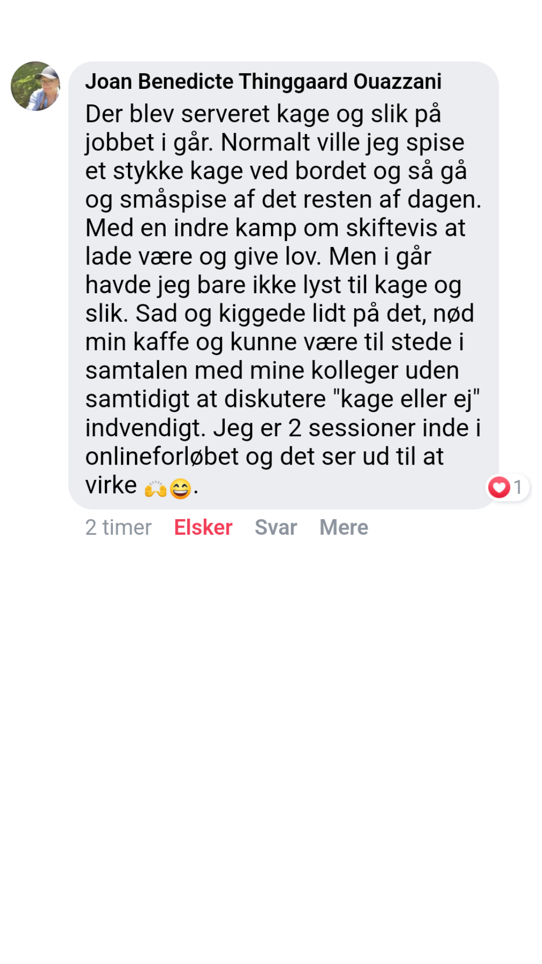 Jeg manglede sparket til ikke at spise så mange søde sager. Efter hypnoserne, lysten til søde var der, men mængden blev mindre og mindre. Jeg har stadig lysten til sødt, men spiser væsentlig mindre, og er gået en buksestørrelse ned nu + har mere energi efter en arbejdsdag end tidligere.