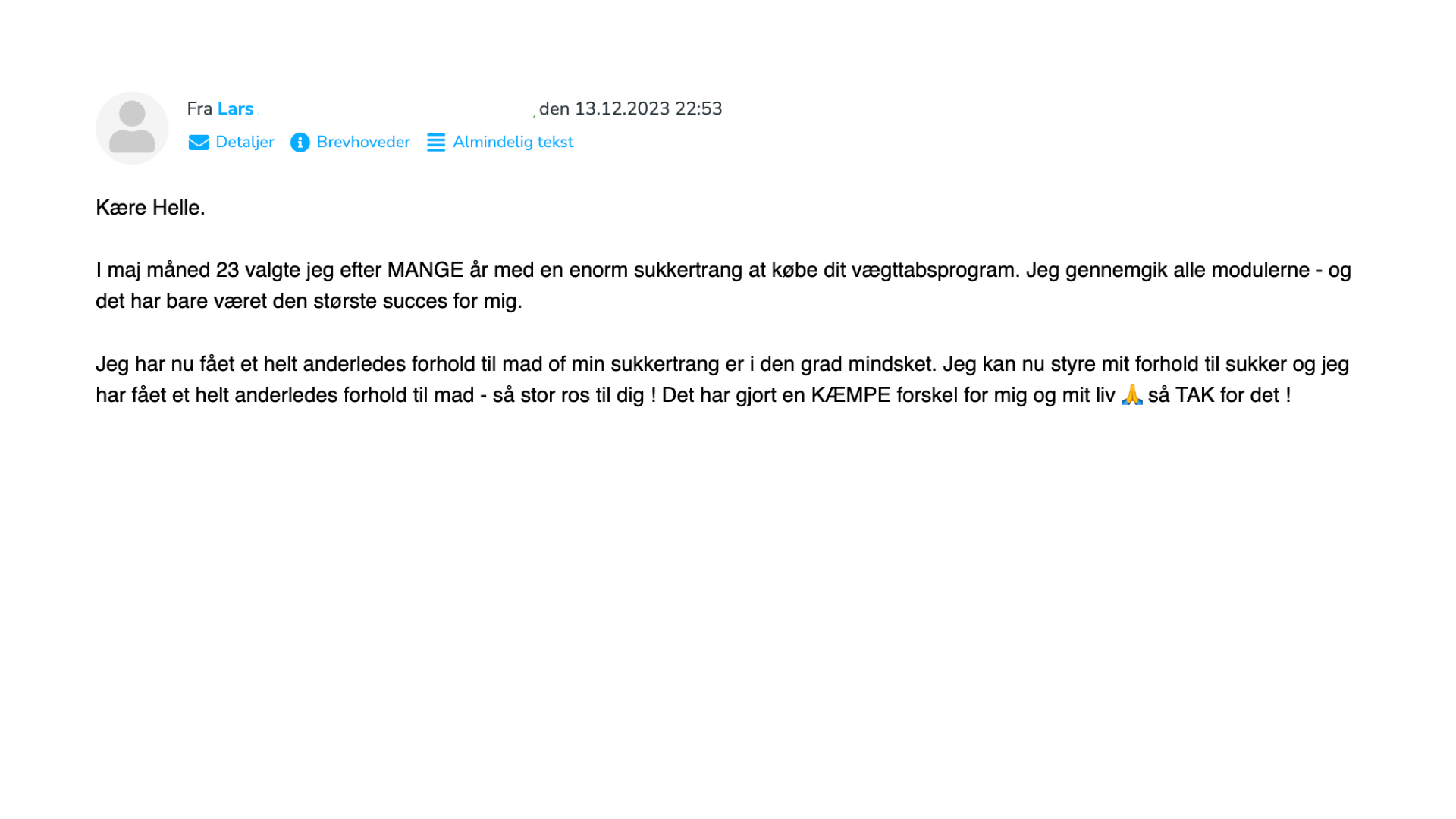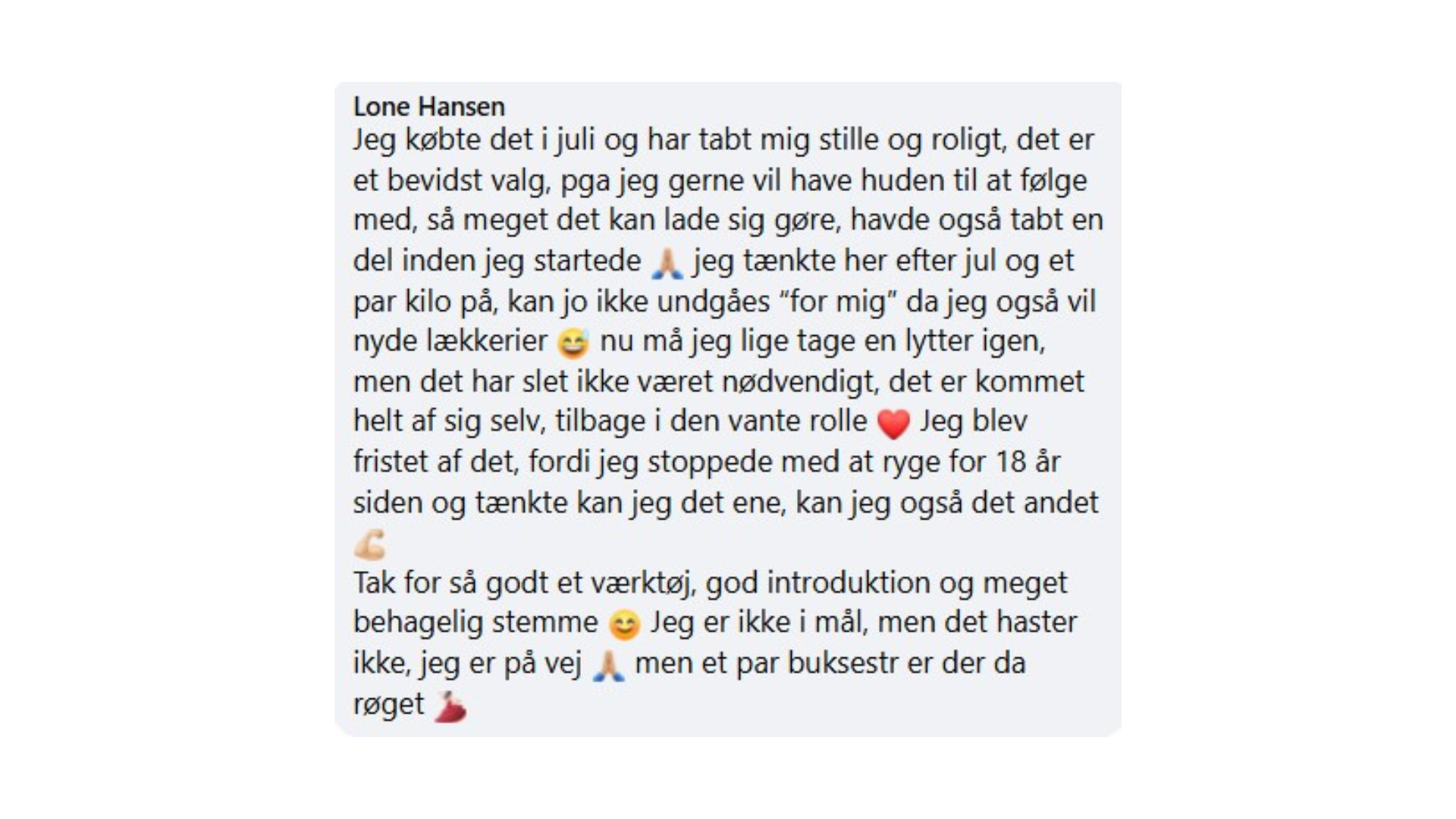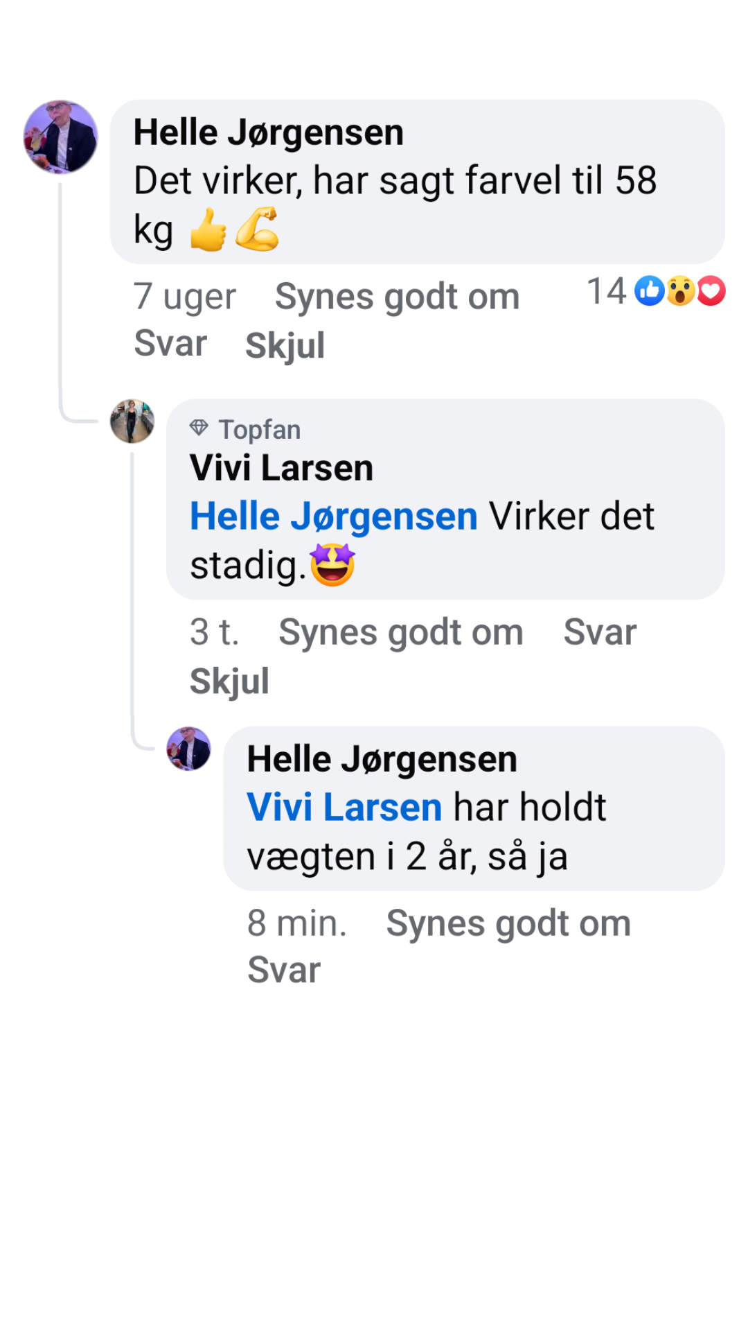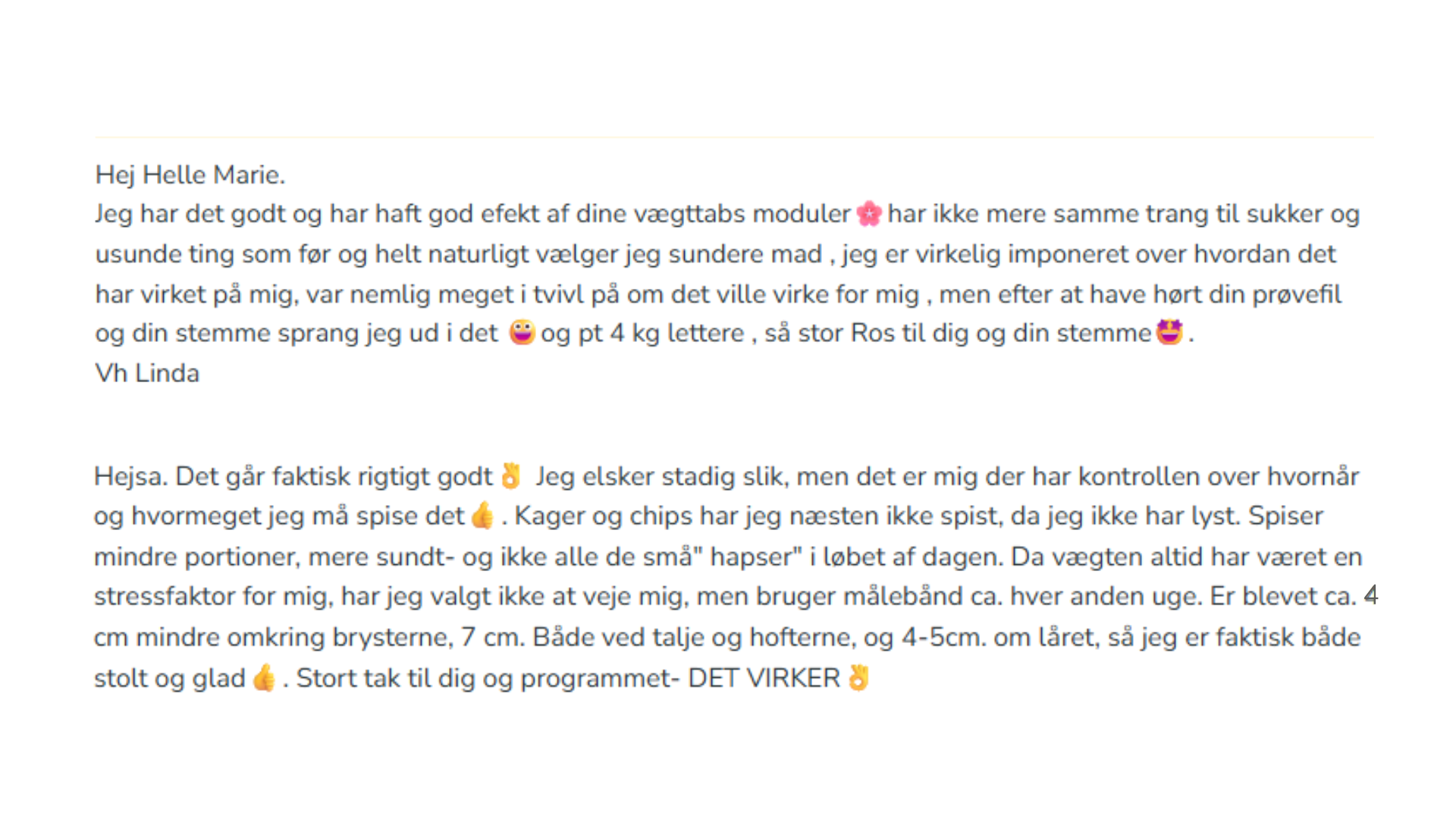 Det føles som en mirakelkur 😍. Jeg synes , at Vægttabsprogrammet er gået over alle mine forventninger. Jeg håber, at det holder ved og lige så snart mine venner og bekendte bemærker mit vægttab, vil jeg være stor fortaler for Vægttabsprogrammet.