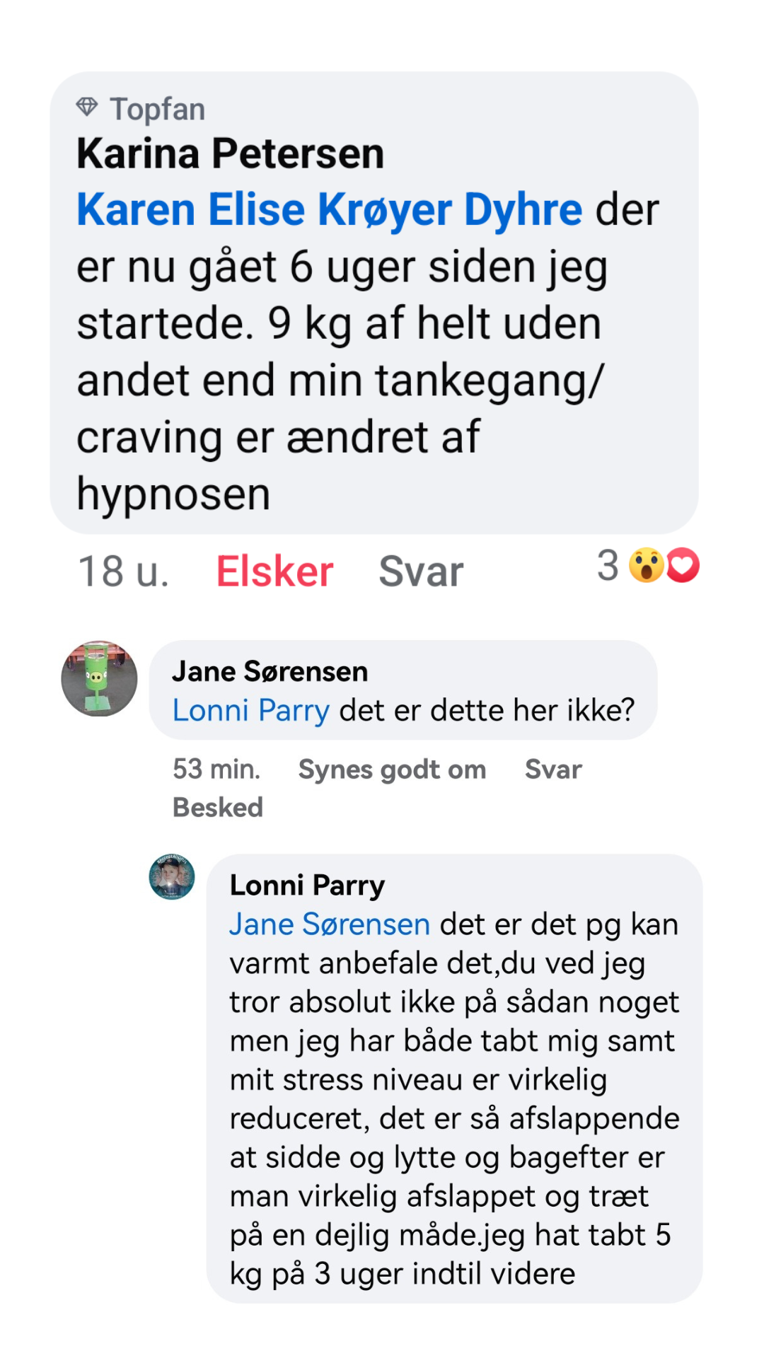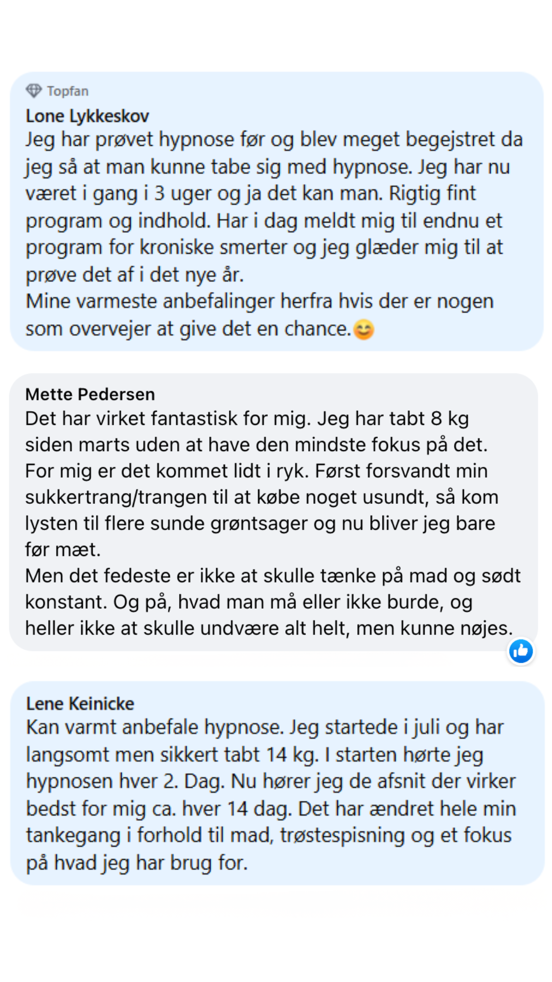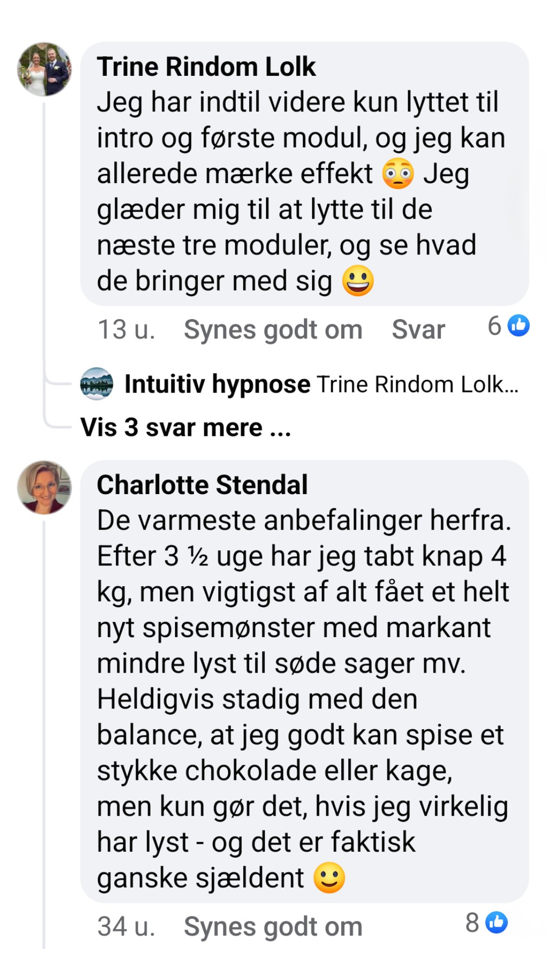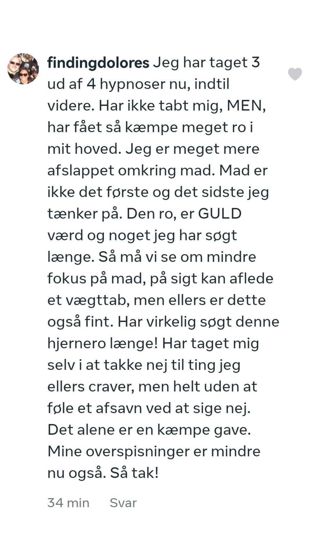 Jeg har prøvet meget, og var klar over det var det mentale der skulle ændres. Hypnoserne var behagelige men tænkte, hvad det skal det kunne ændre. JA for pokker det virker, jeg tænker anderledes, plejer efter kort tid at dumpe helt i, det har jeg ikke gjort denne gang. Så jeg har tabt mig og holder det:-)