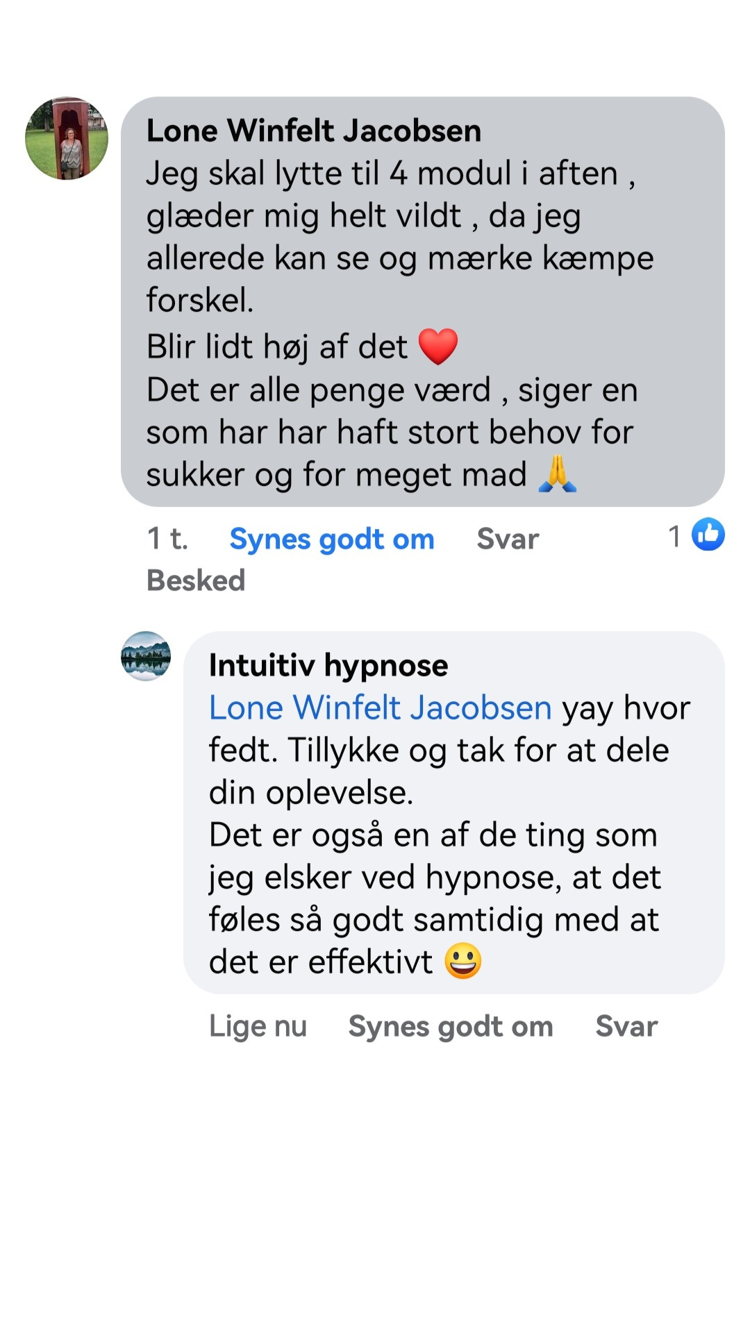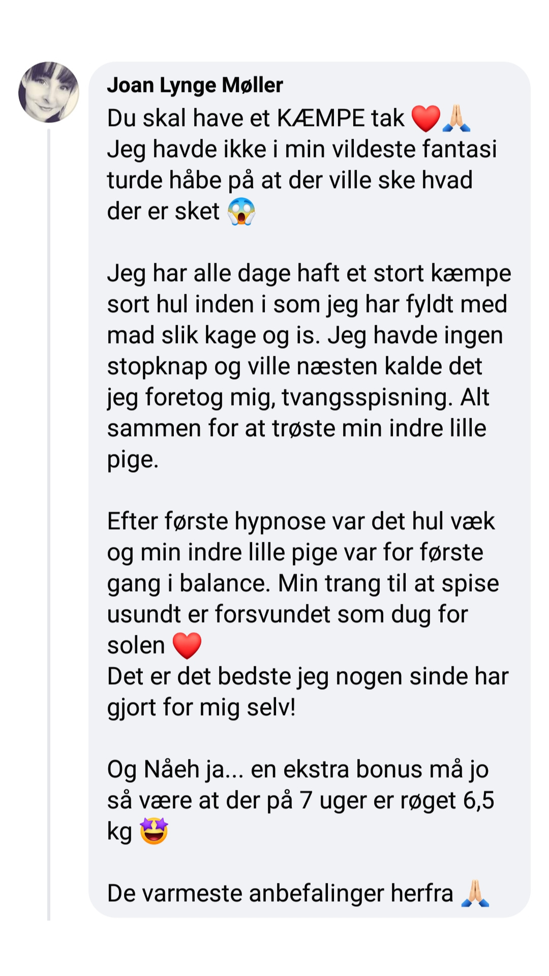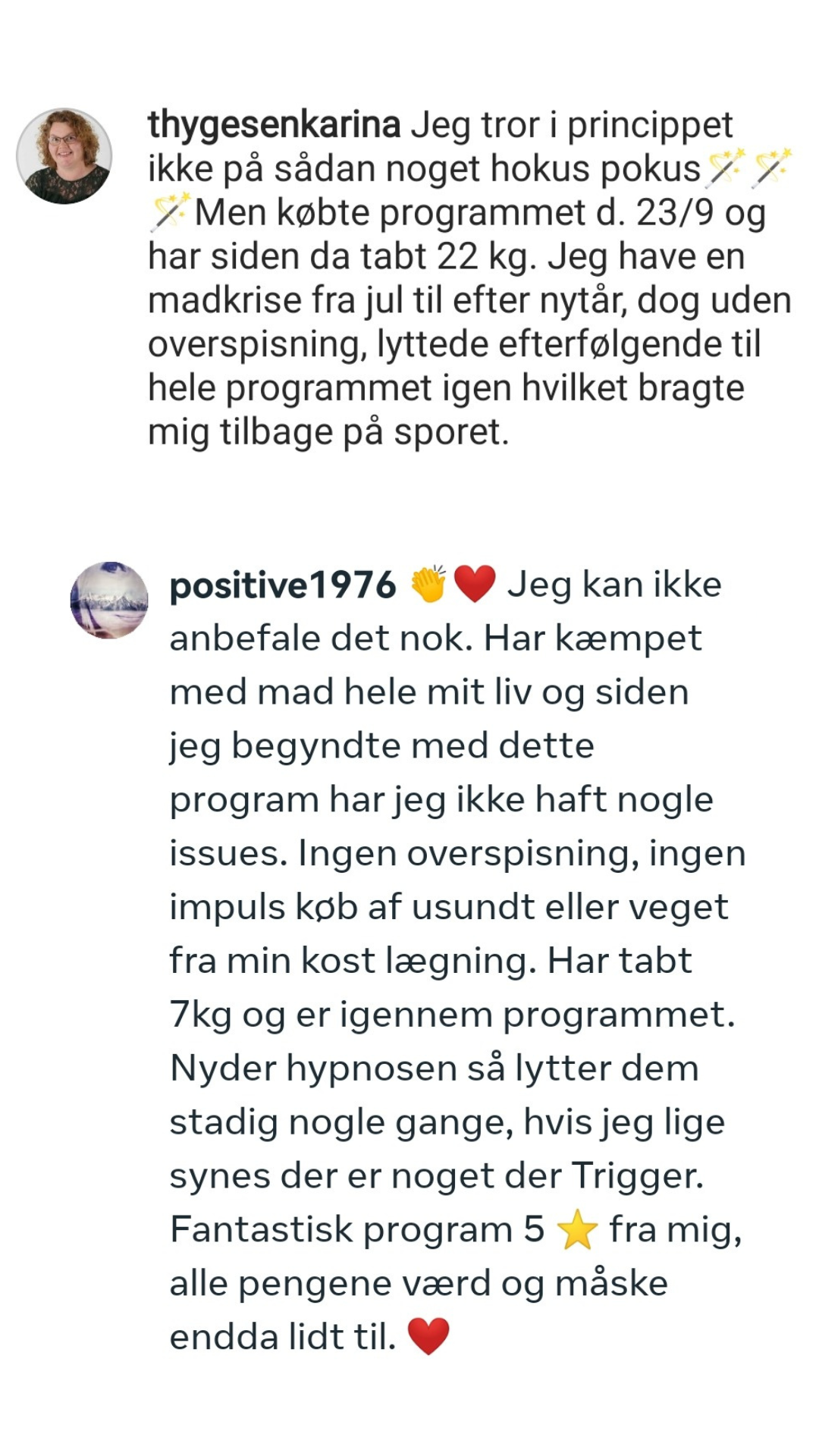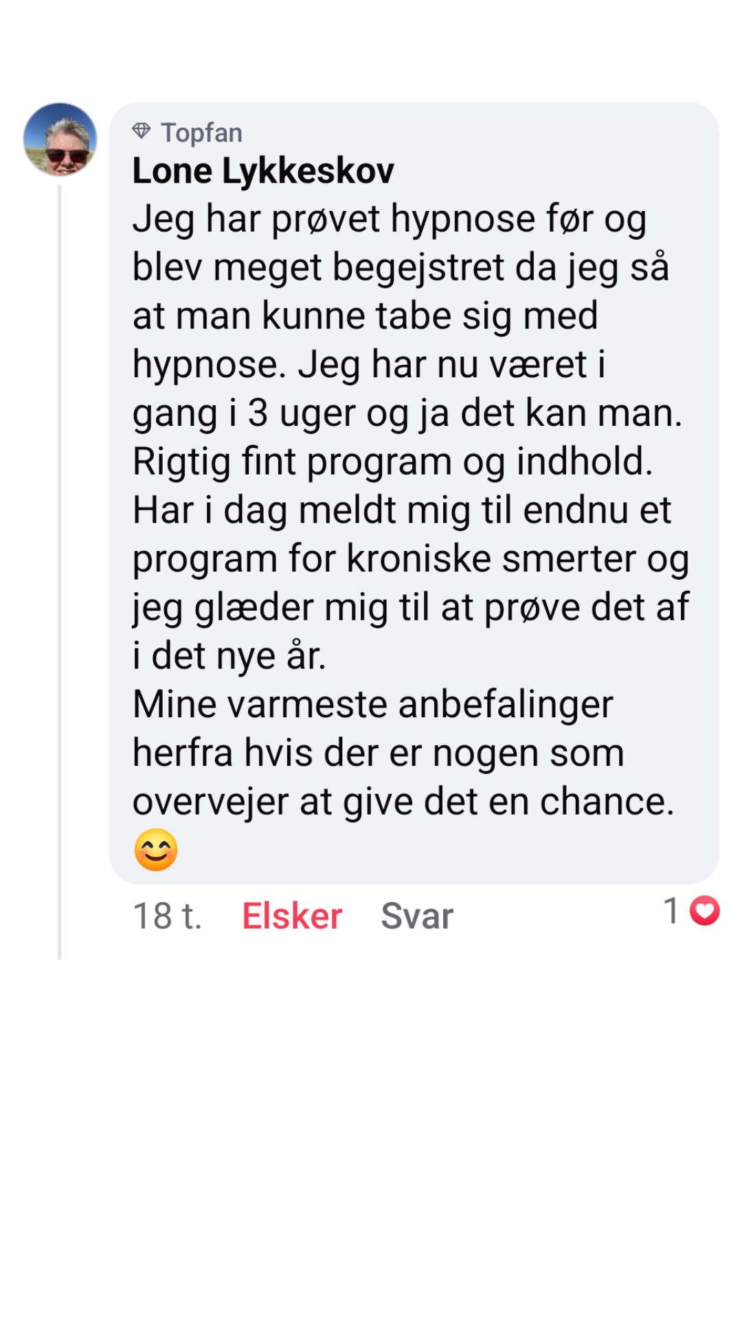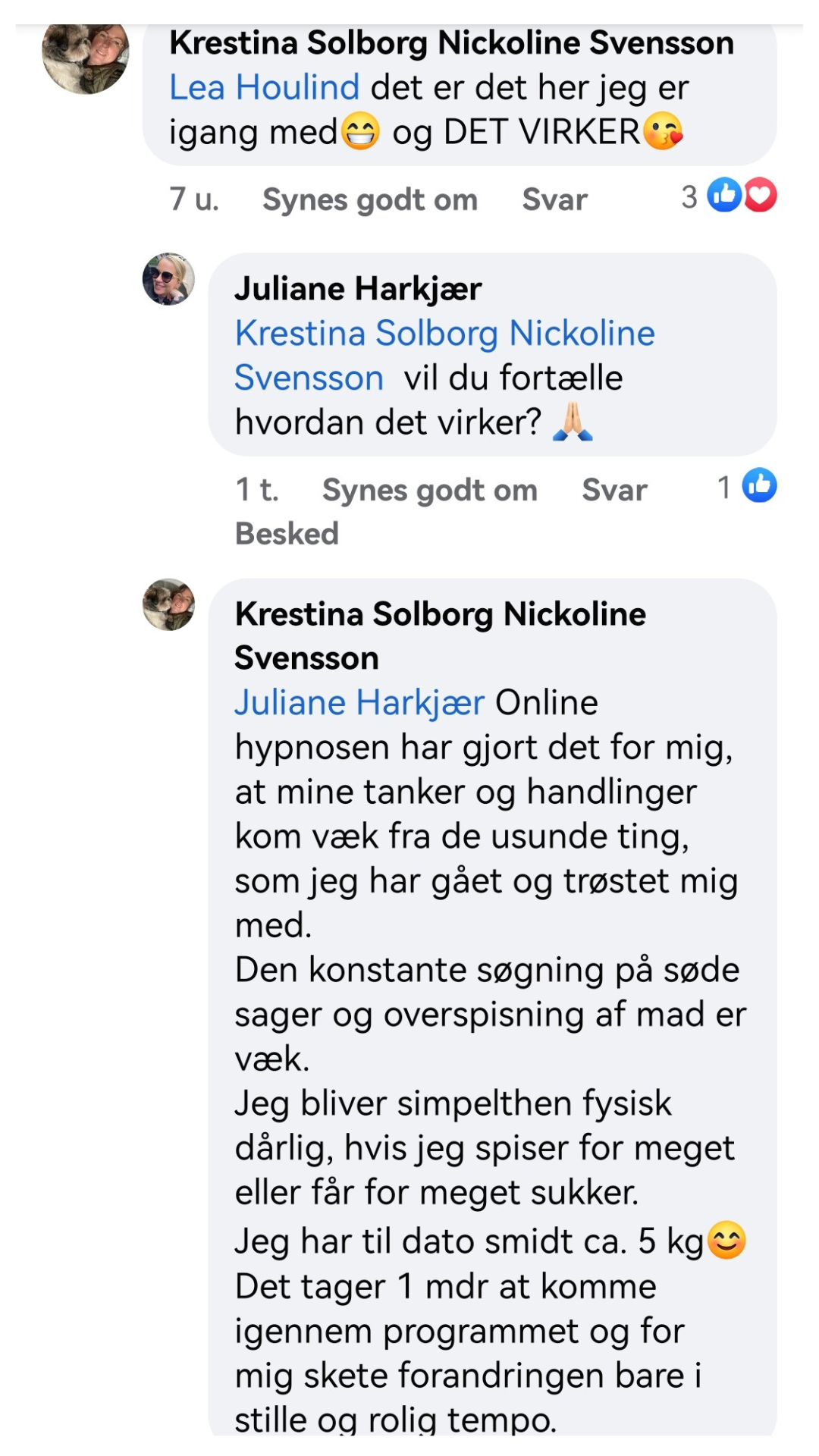 Jeg har prøvet meget, og var klar over det var det mentale der skulle ændres. Hypnoserne var behagelige men tænkte, hvad det skal det kunne ændre. JA for pokker det virker, jeg tænker anderledes, plejer efter kort tid at dumpe helt i, det har jeg ikke gjort denne gang. Så jeg har tabt mig og holder det:-)