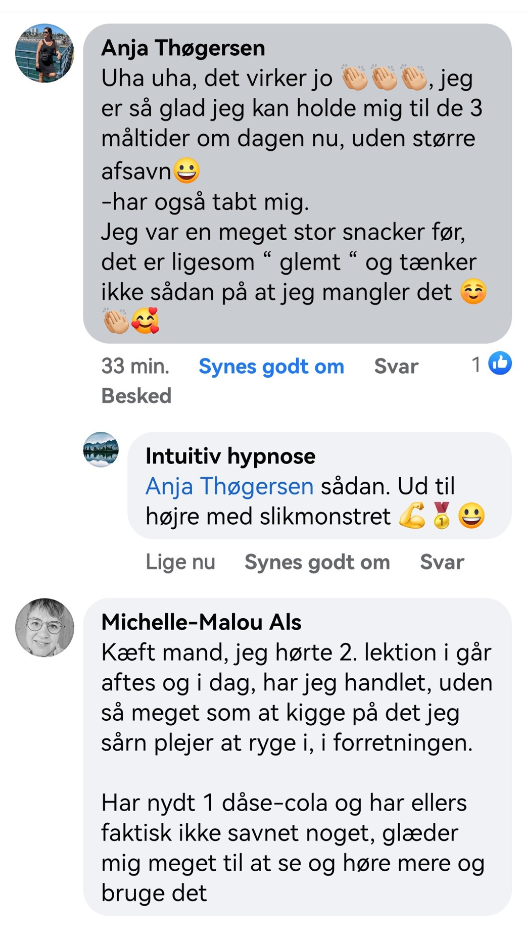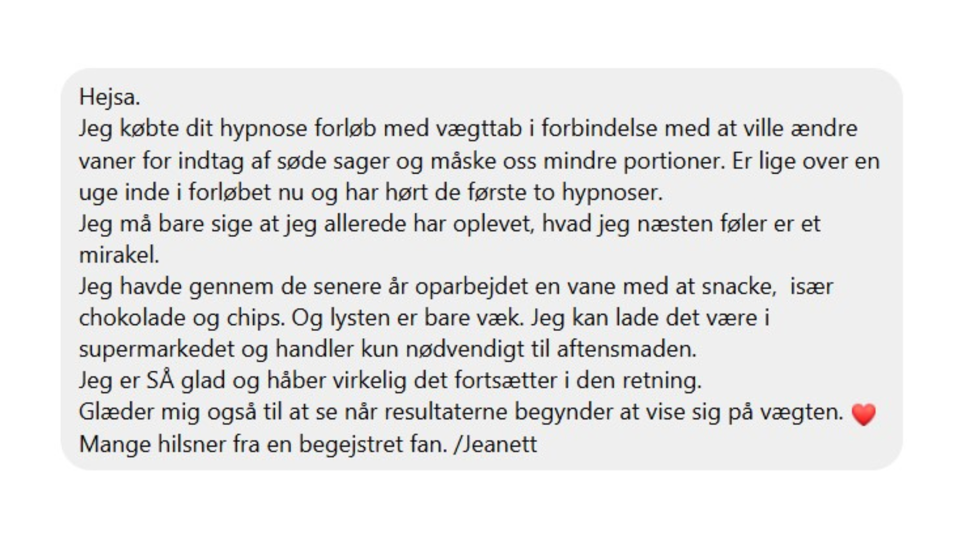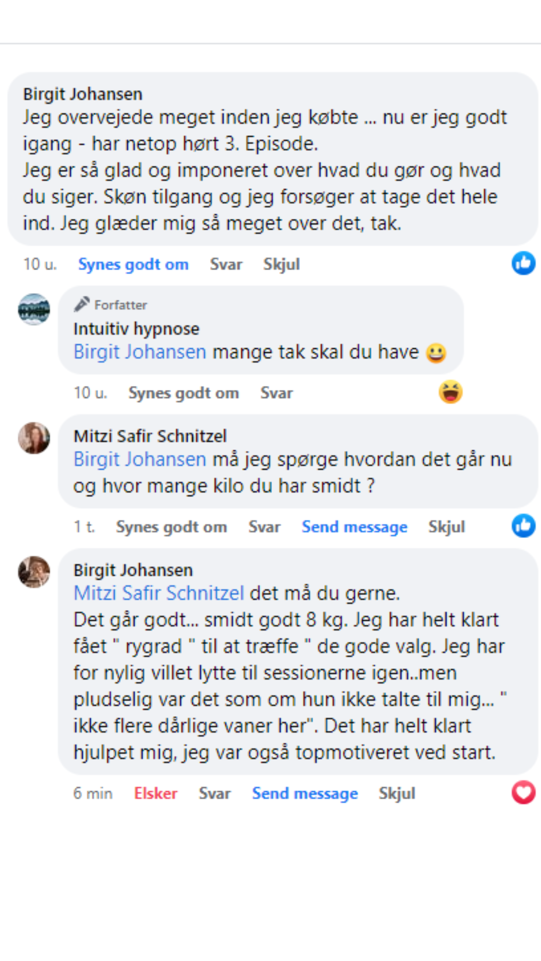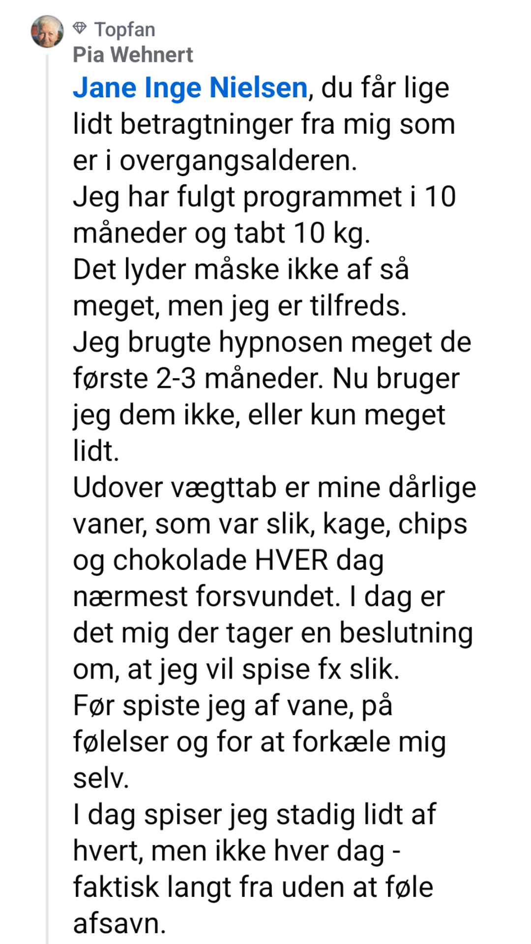 Jeg har prøvet meget, og var klar over det var det mentale der skulle ændres. Hypnoserne var behagelige men tænkte, hvad det skal det kunne ændre. JA for pokker det virker, jeg tænker anderledes, plejer efter kort tid at dumpe helt i, det har jeg ikke gjort denne gang. Så jeg har tabt mig og holder det:-)
