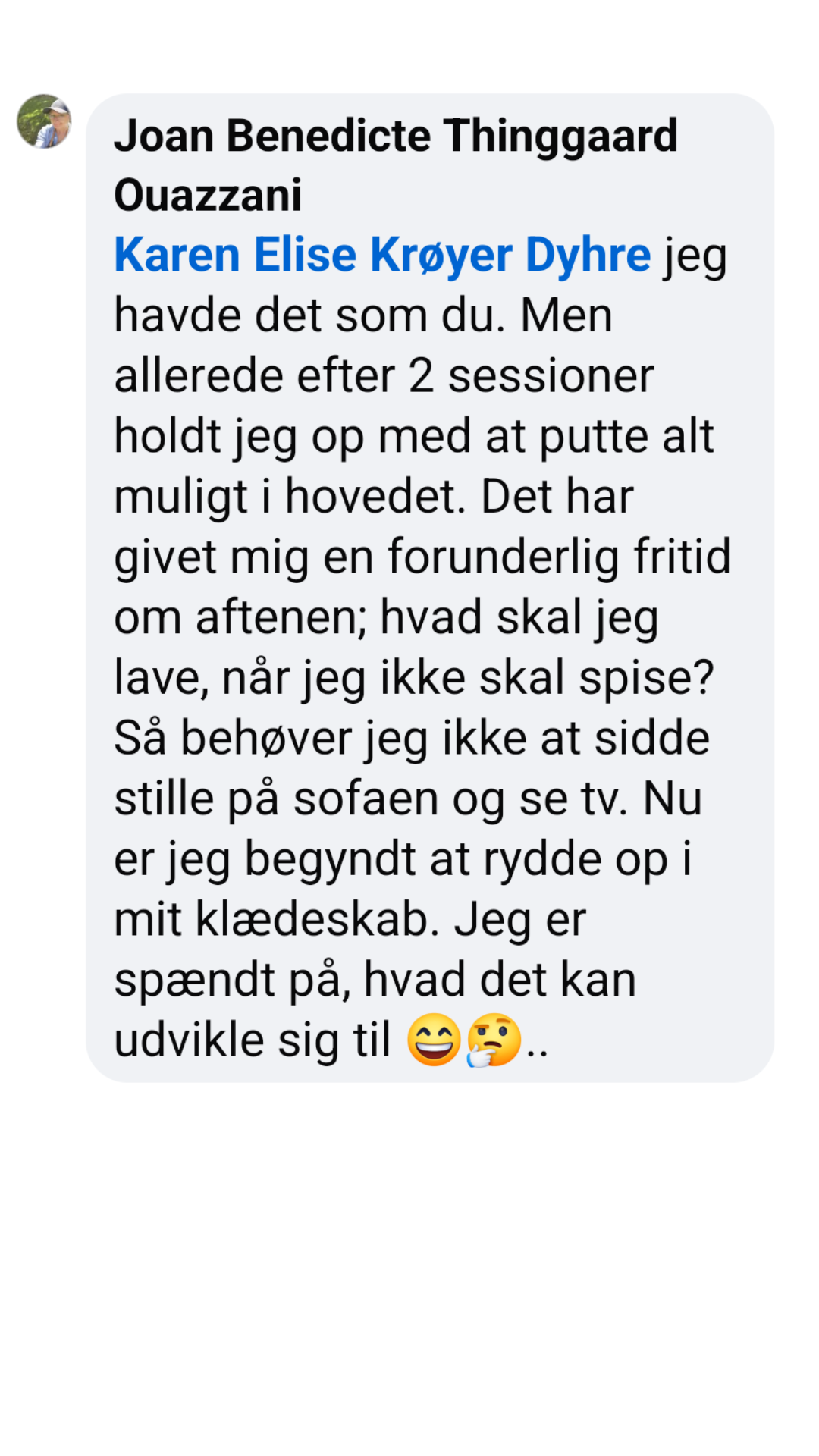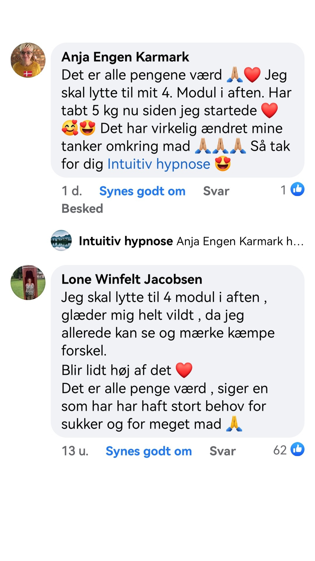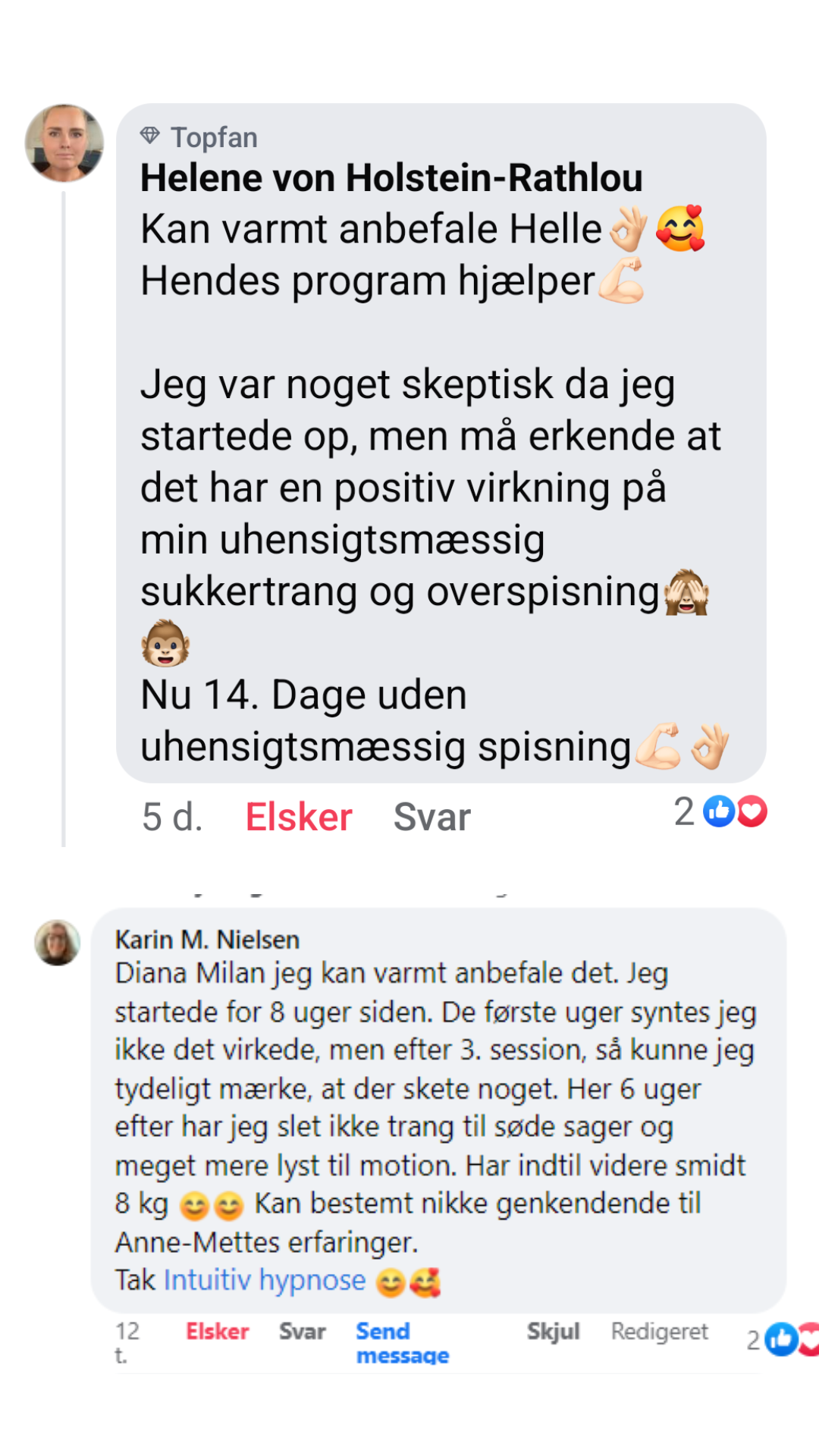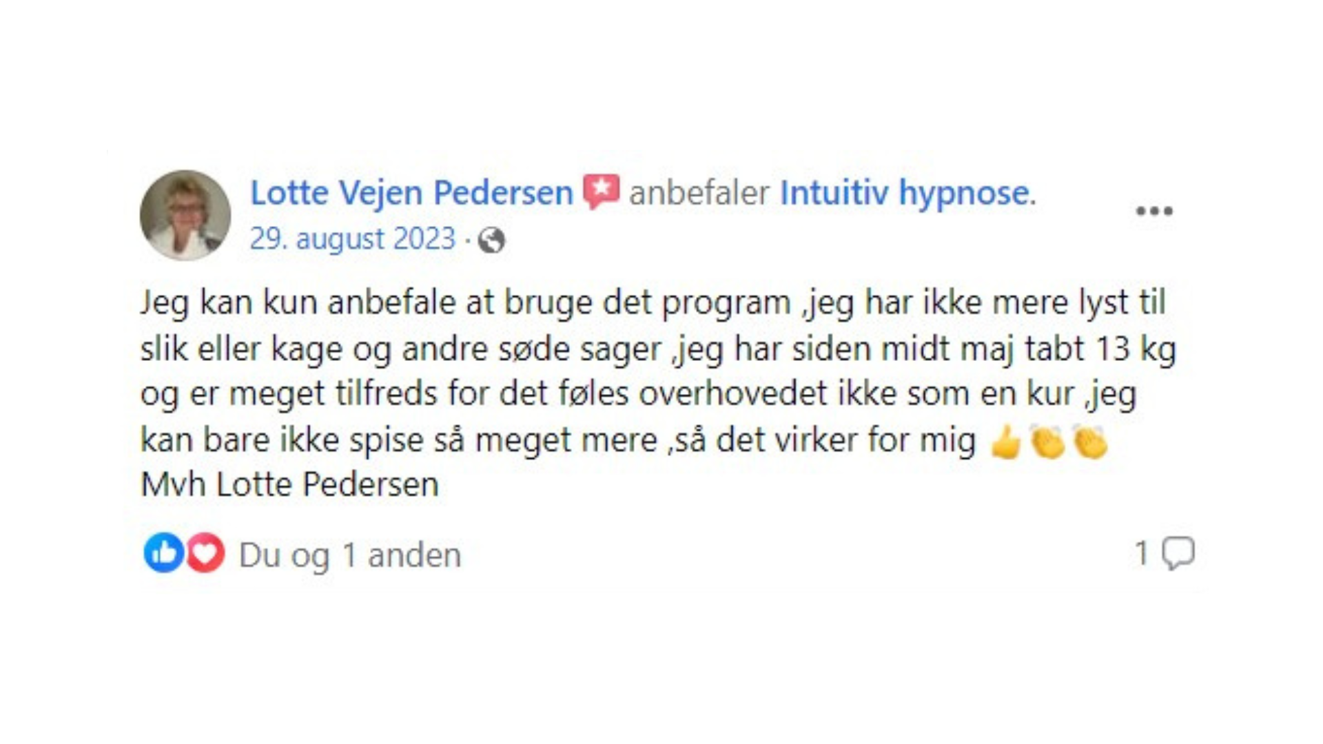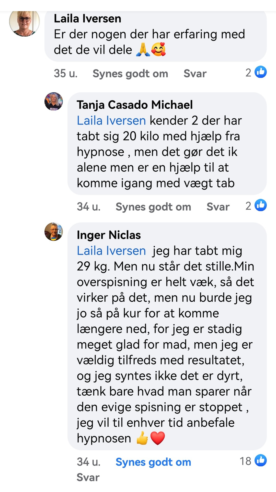 Jeg har prøvet meget, og var klar over det var det mentale der skulle ændres. Hypnoserne var behagelige men tænkte, hvad det skal det kunne ændre. JA for pokker det virker, jeg tænker anderledes, plejer efter kort tid at dumpe helt i, det har jeg ikke gjort denne gang. Så jeg har tabt mig og holder det:-)