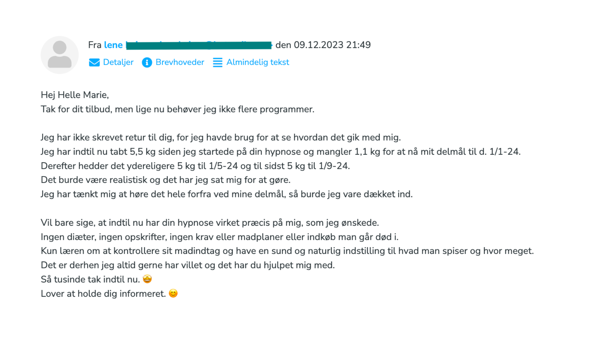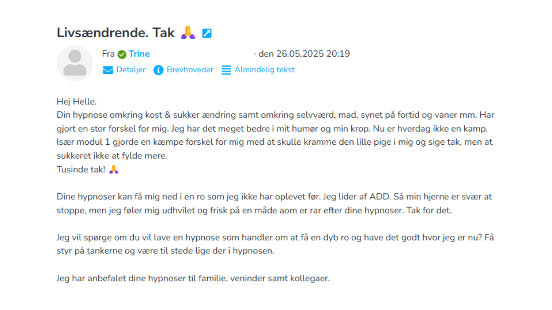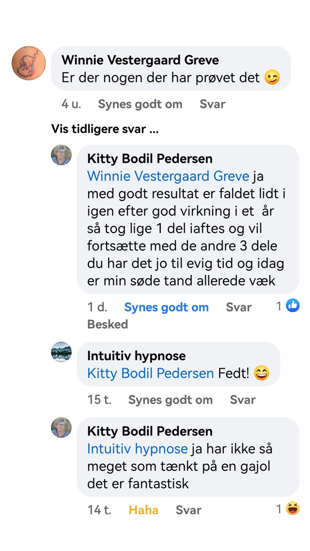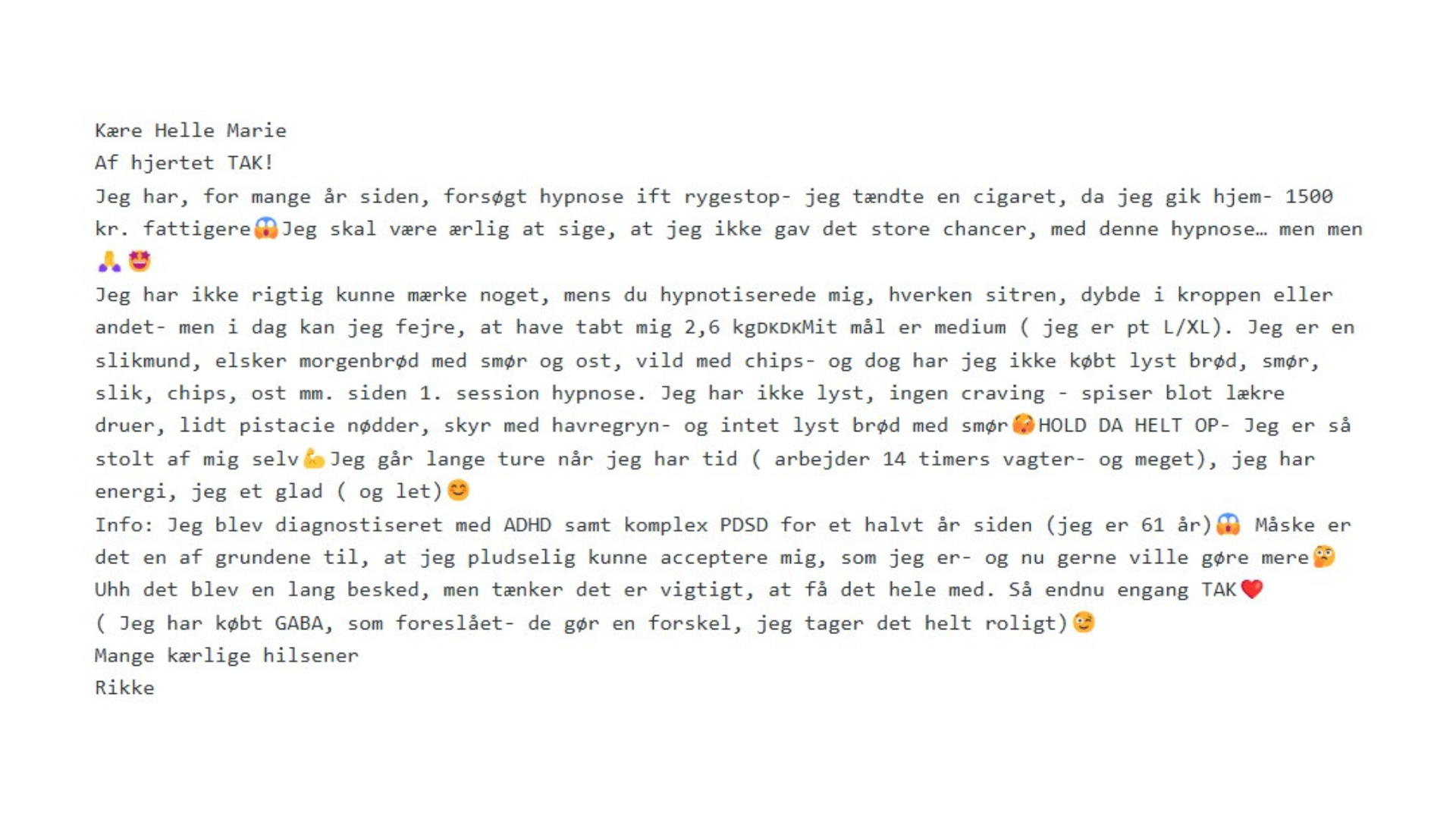 Jeg har prøvet meget, og var klar over det var det mentale der skulle ændres. Hypnoserne var behagelige men tænkte, hvad det skal det kunne ændre. JA for pokker det virker, jeg tænker anderledes, plejer efter kort tid at dumpe helt i, det har jeg ikke gjort denne gang. Så jeg har tabt mig og holder det:-)