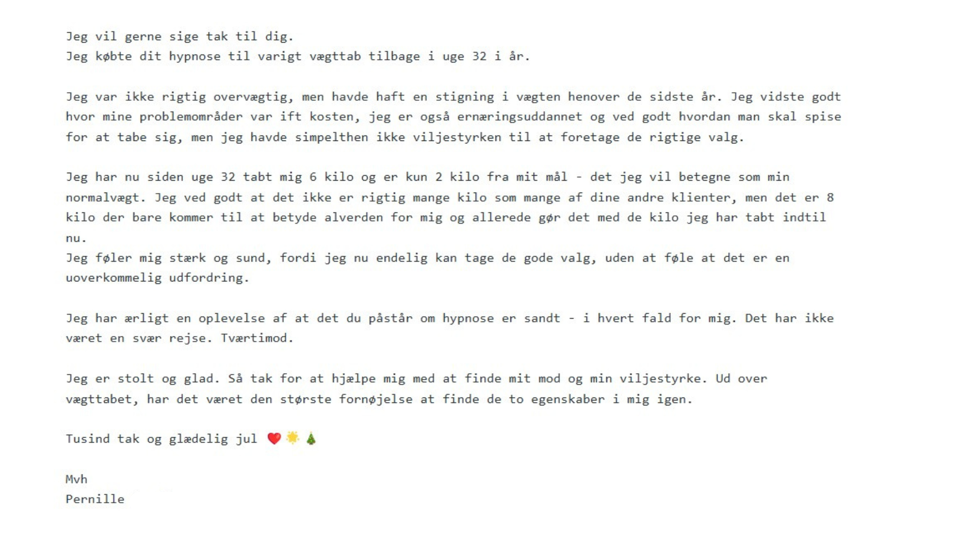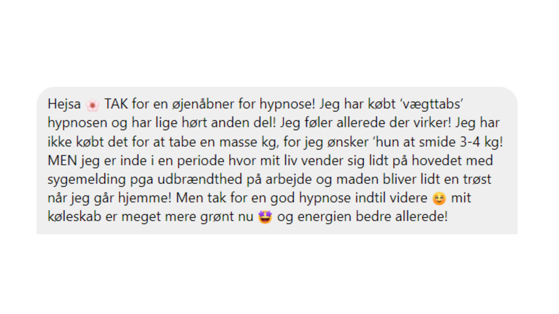 Jeg har lige været på dit slanke hypnose kursus . Det har været super godt - spiser mindre, spiser ikke chokolade og chips. Har tabt 3 kg fedt - fedt!