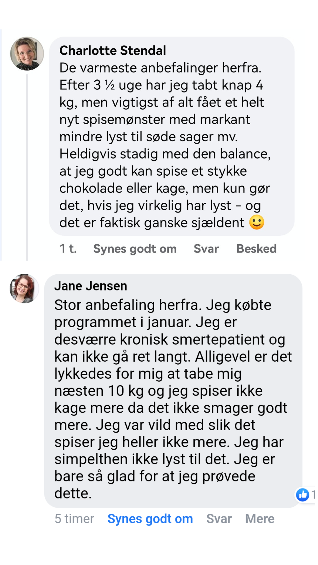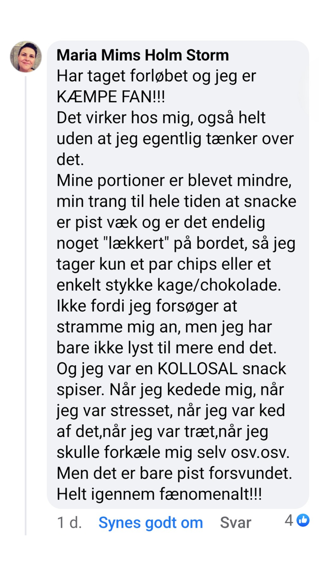 Naturligt vægttab uden afsavn og kampe med dig selv. Lyst til det usunde forsvinder, så du bliver ligeglad med de fødevarer der normalt fik dig til at spise for meget.