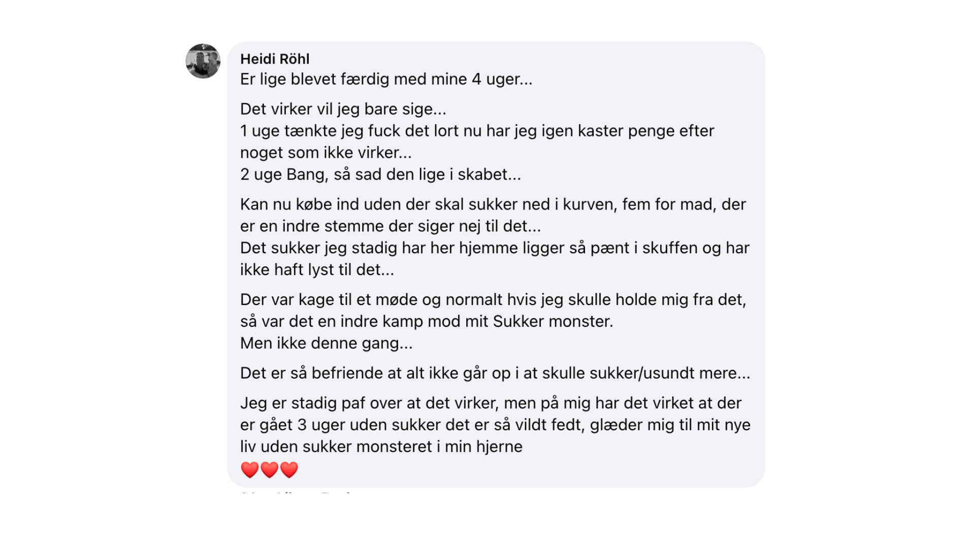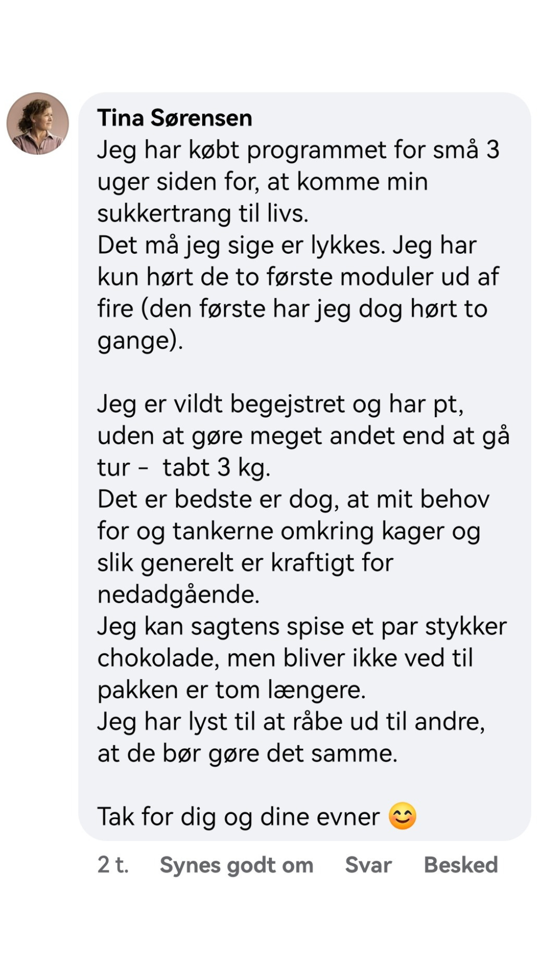 Det var først da jeg fik arbejdet med de dybereliggende årsager via hypnose, at jeg endelig fik bugt med sukkertrangen. Og det resultat kan du også få.