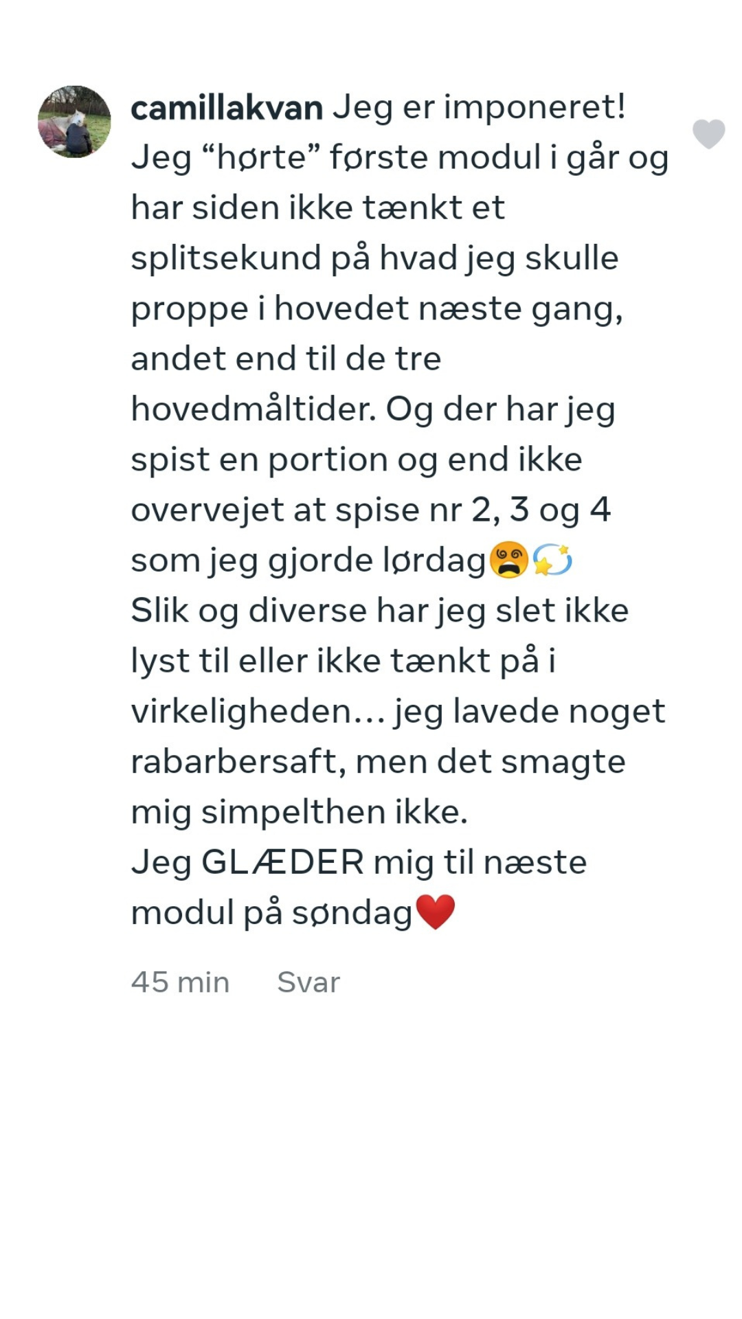 Programmet hjælper med at skabe nye, sunde vaner. Fra første session oplever du mere ro omkring mad, krop og vægt.