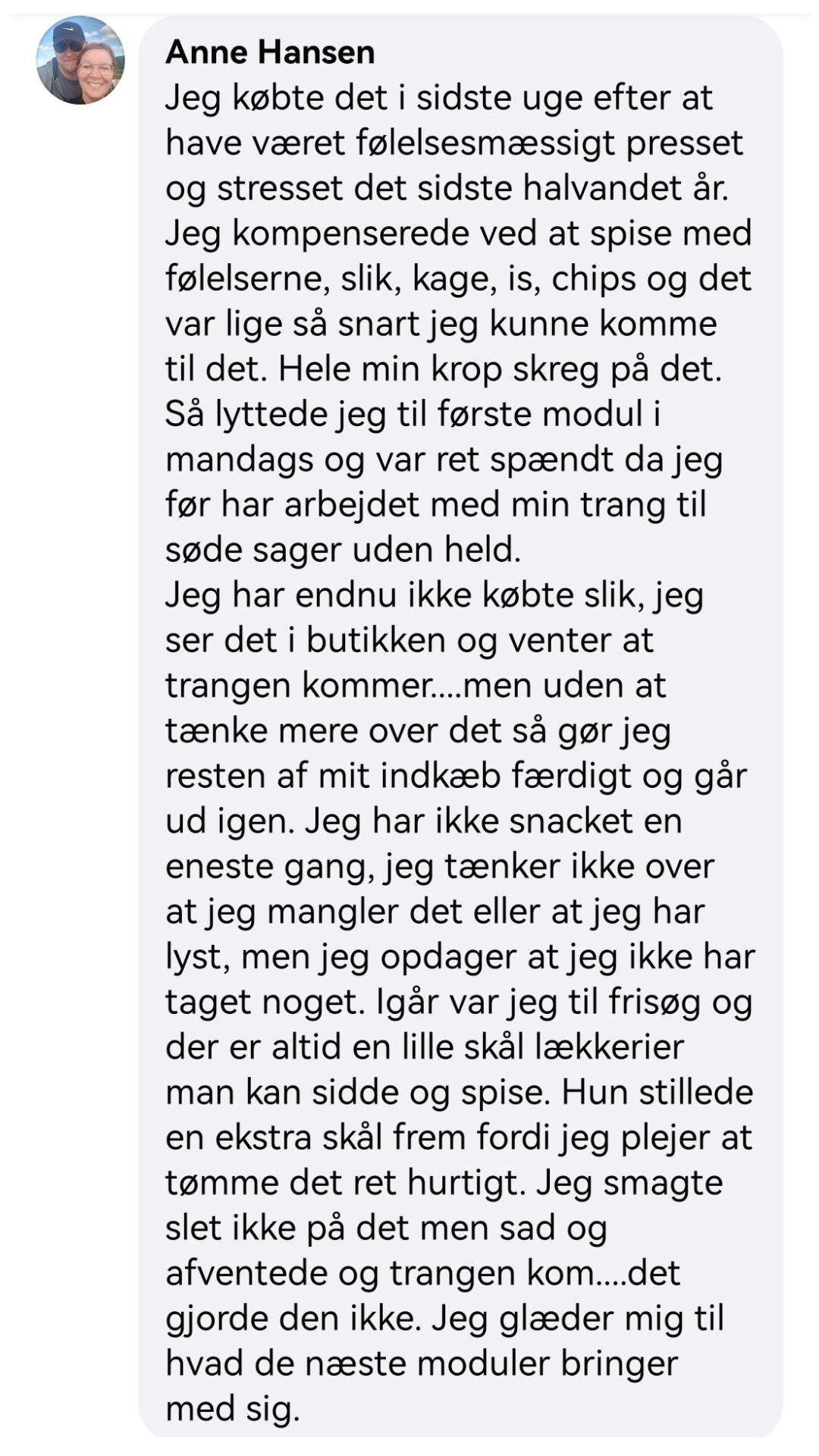 Jeg købte programmet fordi jeg havde brug for at arbejde med det der sker i hovedet og tankerne angående overvægt. Og hvorfor jeg valgte at spise på følelser.